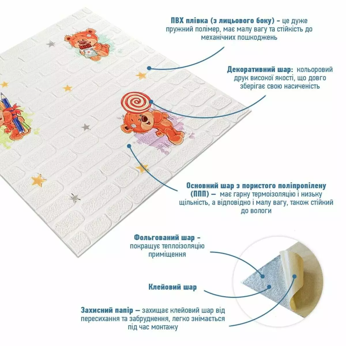 - Захисний папір – оберігає клейовий шар від пересихання та забруднення, легко знімається під час монтажу.