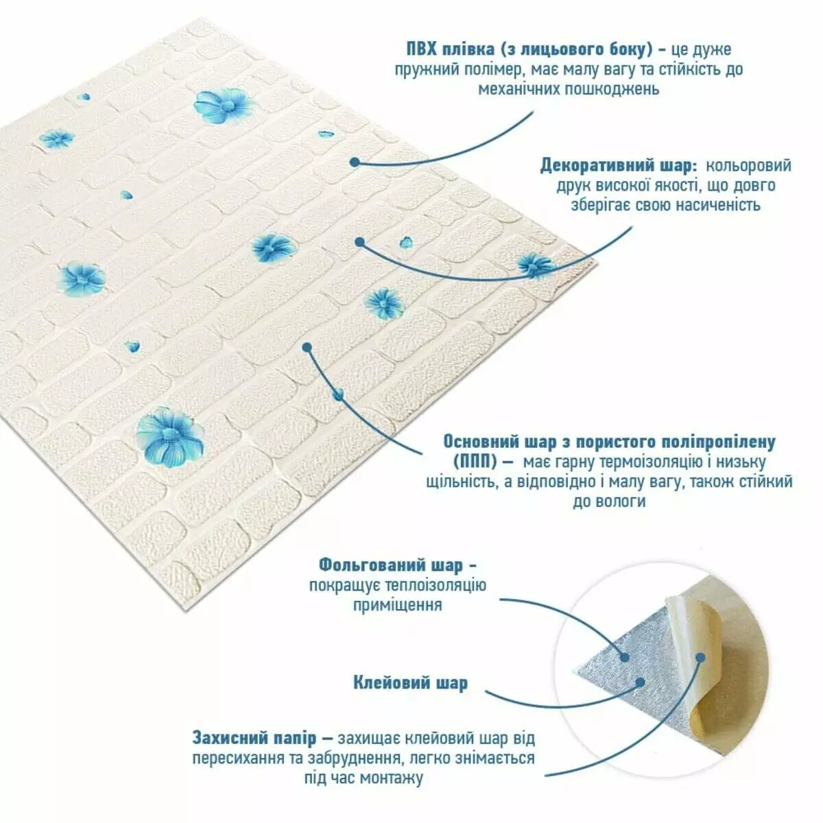 - Захисний папір – оберігає клейовий шар від пересихання та забруднення, легко знімається під час монтажу.