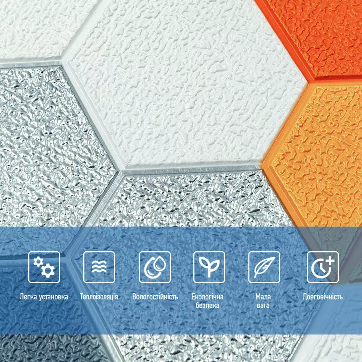 - Легкість монтажу: наявність клейового шару дозволяє встановити панелі без необхідності застосування додаткових матеріалів.