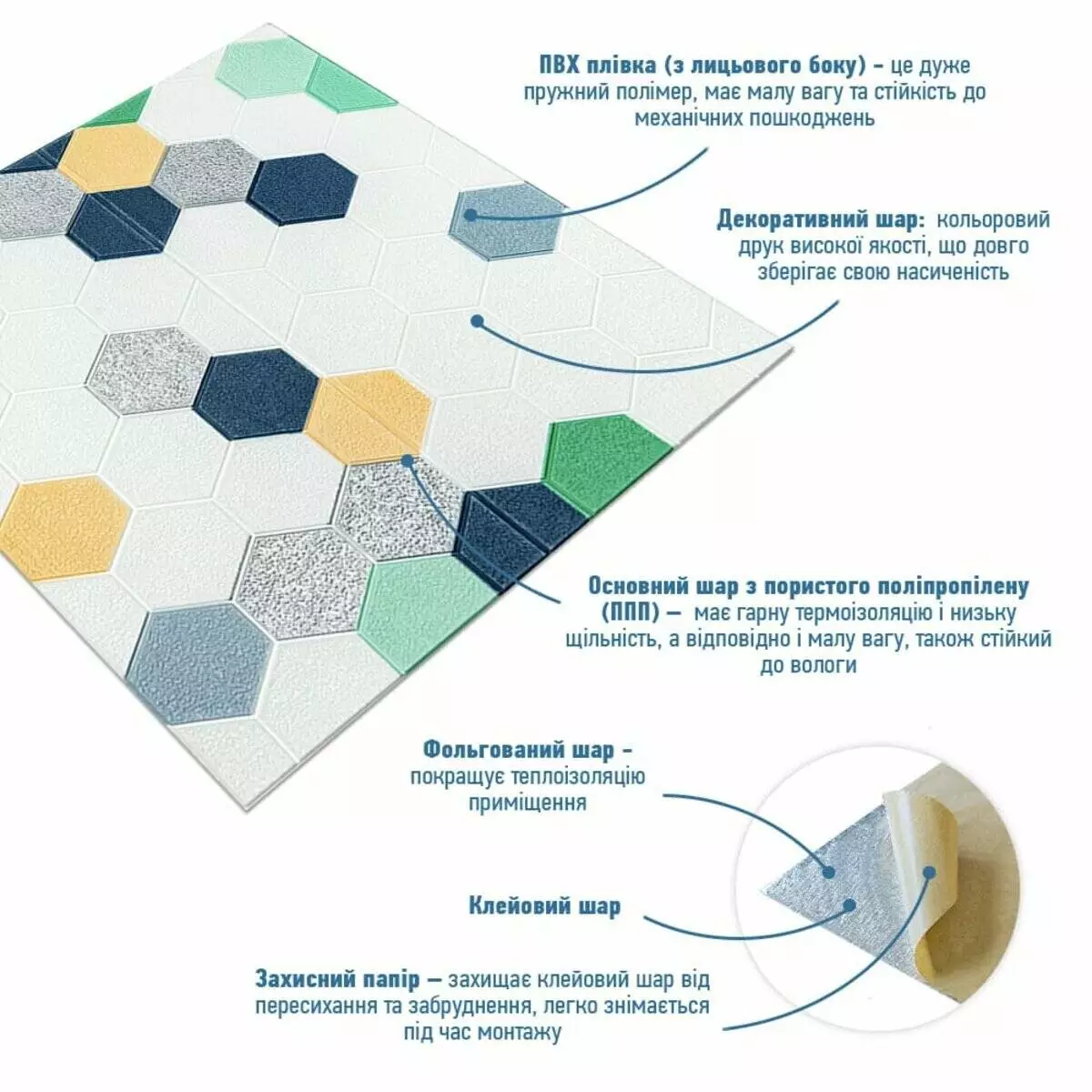 - Легкість монтажу: наявність клейового шару дозволяє встановити панелі без необхідності застосування додаткових матеріалів.