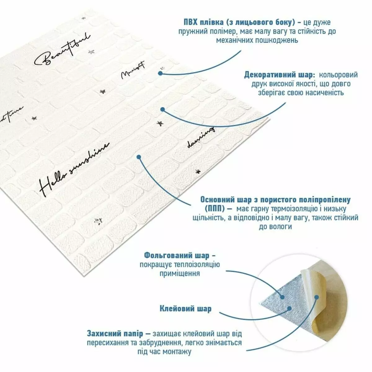 3D панелі самоклеючі – декоративне покриття для стін, виконане з легкого та міцного матеріалу – пористого поліпропілену (ППП). Основна особливість – рельєфний малюнок у вигляді цегли у широкому різноманітті кольорів та наявність клейового шару, що дозволяє встановити панелі без необхідності застосування додаткових матеріалів.