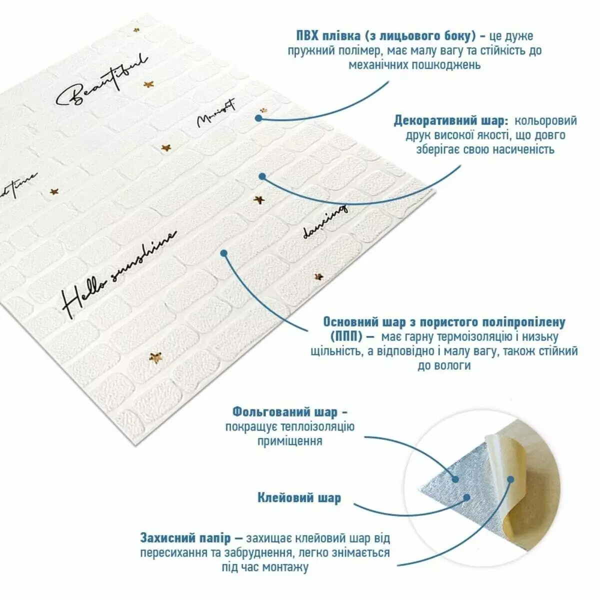- Захисний папір – оберігає клейовий шар від пересихання та забруднення, легко знімається під час монтажу.