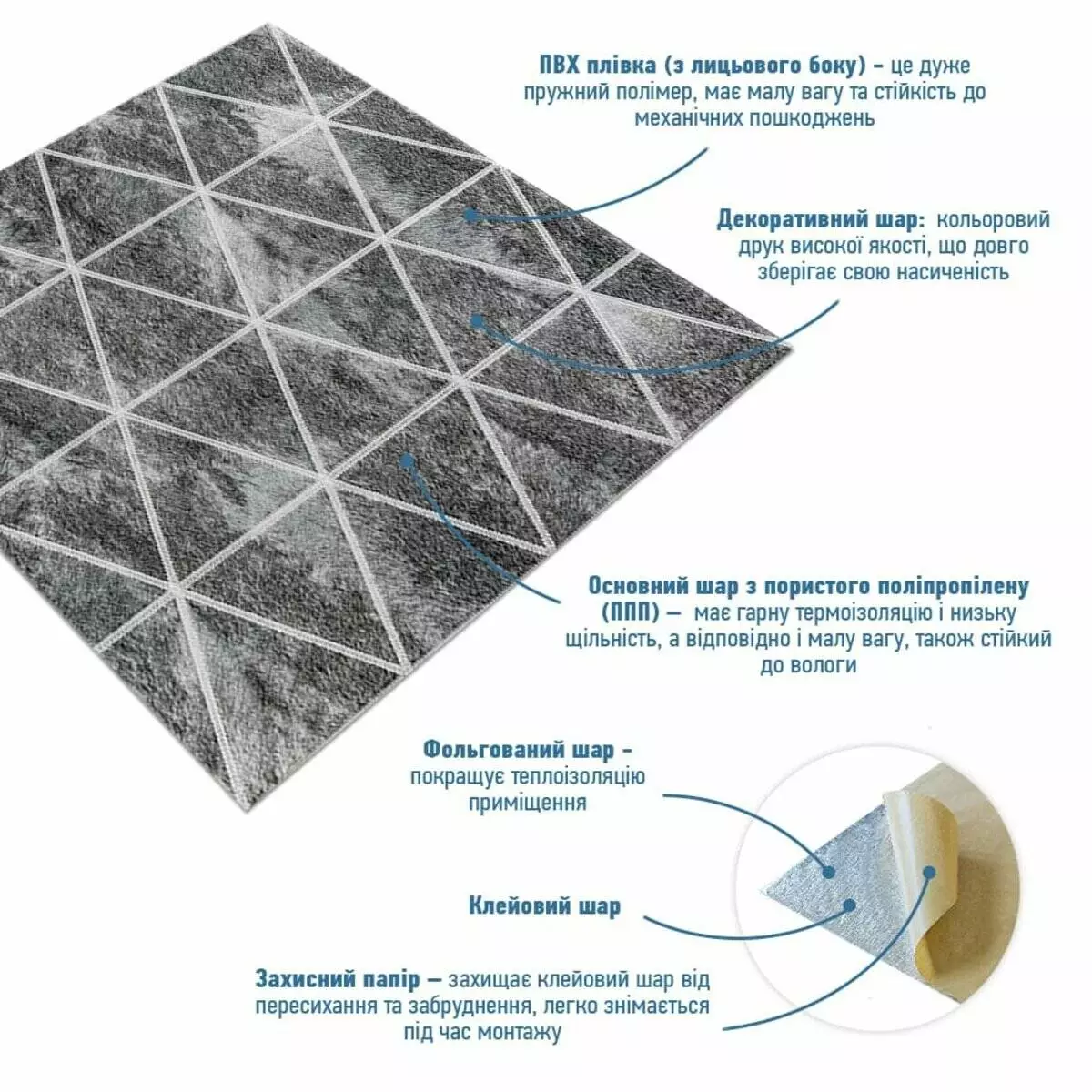 - Захисний папір – оберігає клейовий шар від пересихання та забруднення, легко знімається під час монтажу.