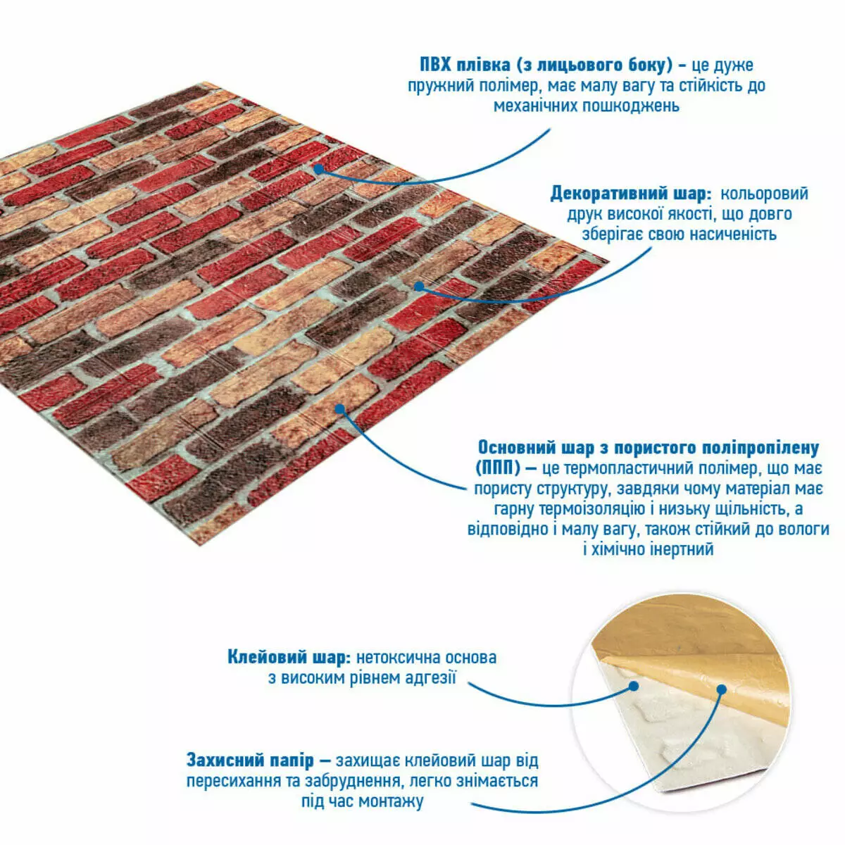 - Захисний папір – оберігає клейовий шар від пересихання та забруднення, легко знімається під час монтажу.