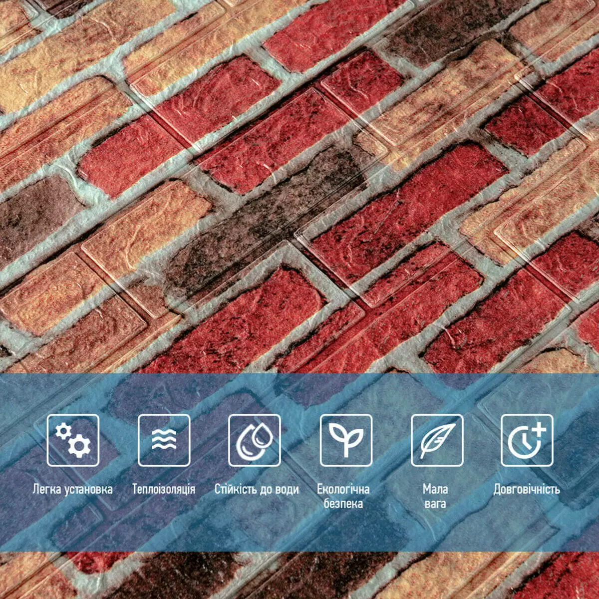 3D панелі самоклеючі – декоративне покриття для стін, виконане з легкого та міцного матеріалу – пористого поліпропілену (ППП). Основна особливість – рельєфний малюнок у вигляді цегли у широкому різноманітті кольорів та наявність клейового шару, що дозволяє встановити панелі без необхідності застосування додаткових матеріалів.