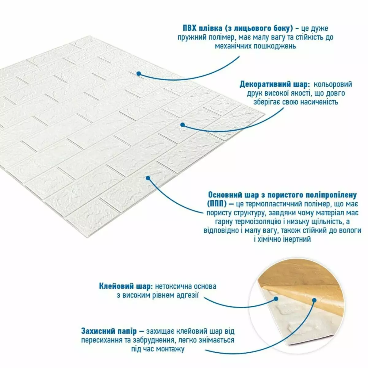 - Захисний папір – оберігає клейовий шар від пересихання та забруднення, легко знімається під час монтажу.