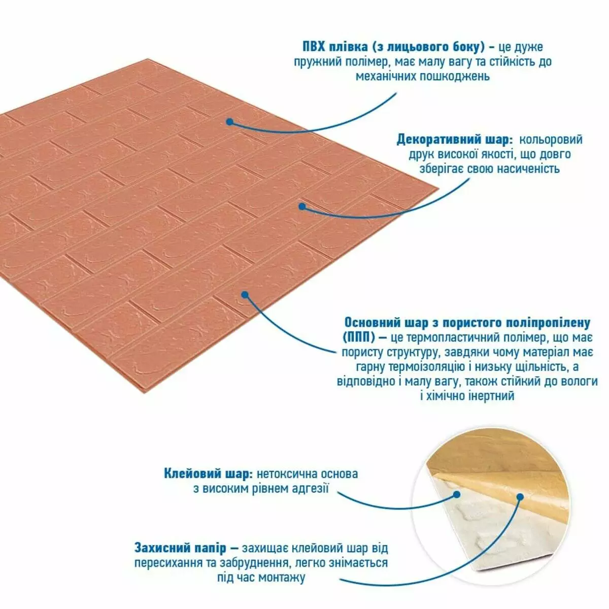 3D панелі самоклеючі – декоративне покриття для стін, виконане з легкого та міцного матеріалу – пористого поліпропілену (ППП). Основна особливість – рельєфний малюнок у вигляді цегли у широкому різноманітті кольорів та наявність клейового шару, що дозволяє встановити панелі без необхідності застосування додаткових матеріалів.