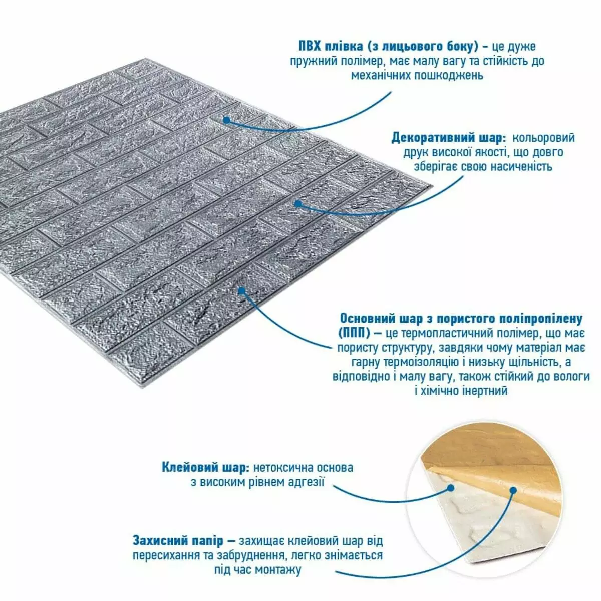 - Захисний папір – оберігає клейовий шар від пересихання та забруднення, легко знімається під час монтажу.