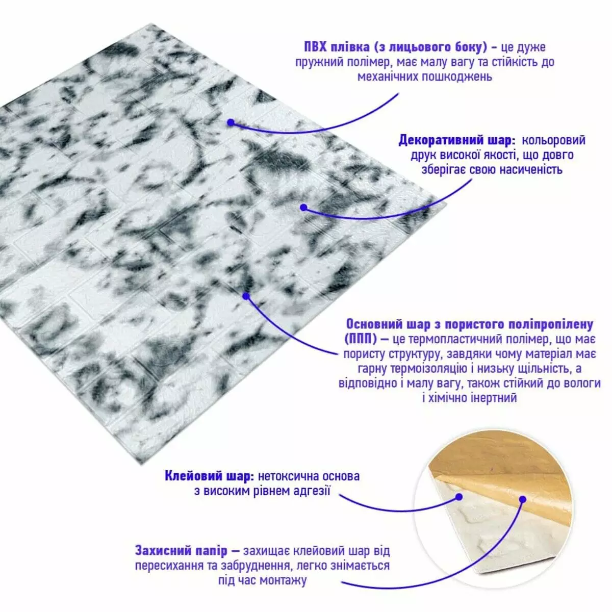 - Захисний папір – оберігає клейовий шар від пересихання та забруднення, легко знімається під час монтажу.