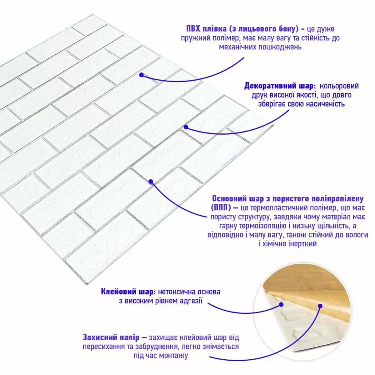 - Захисний папір – оберігає клейовий шар від пересихання та забруднення, легко знімається під час монтажу.