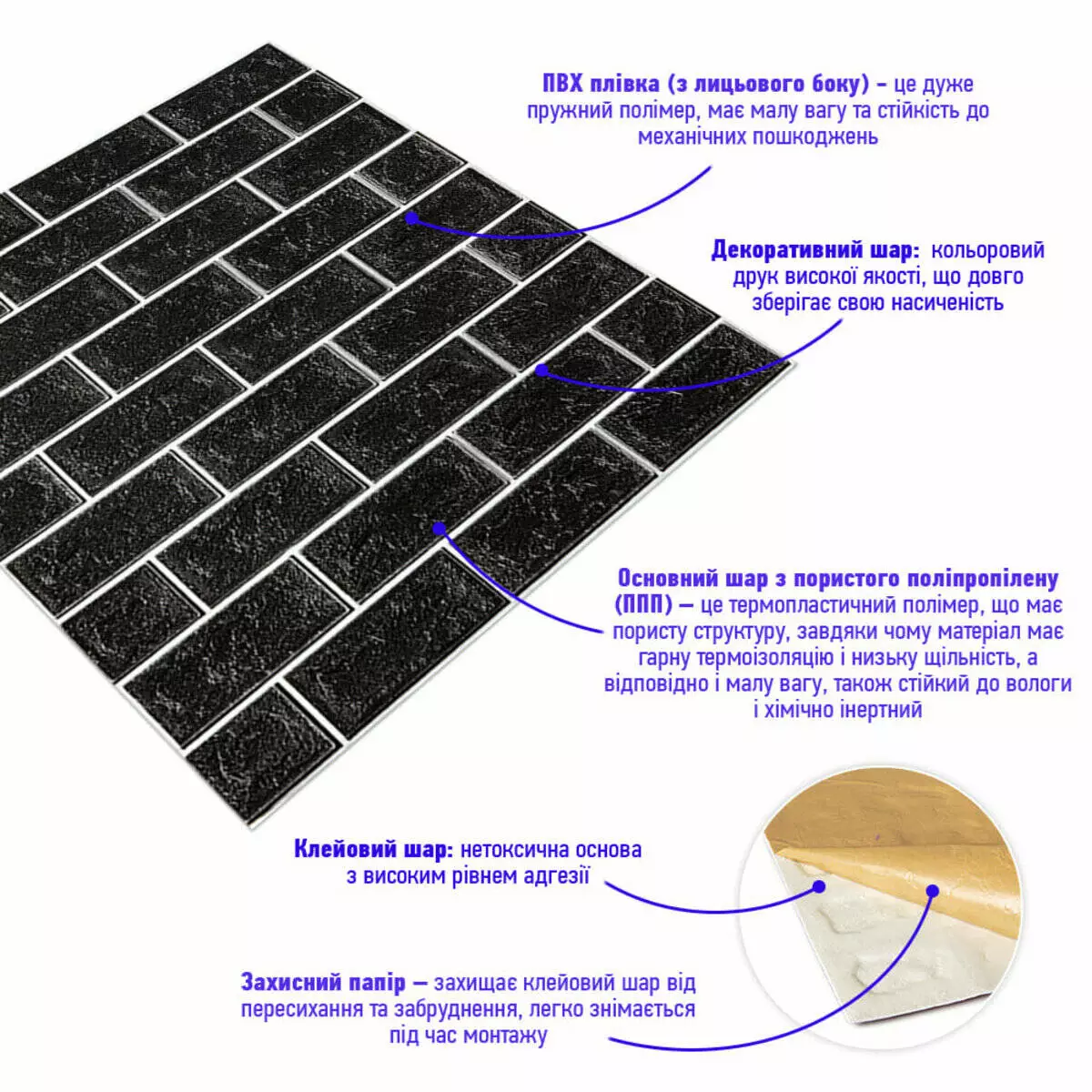 - Захисний папір – оберігає клейовий шар від пересихання та забруднення, легко знімається під час монтажу.