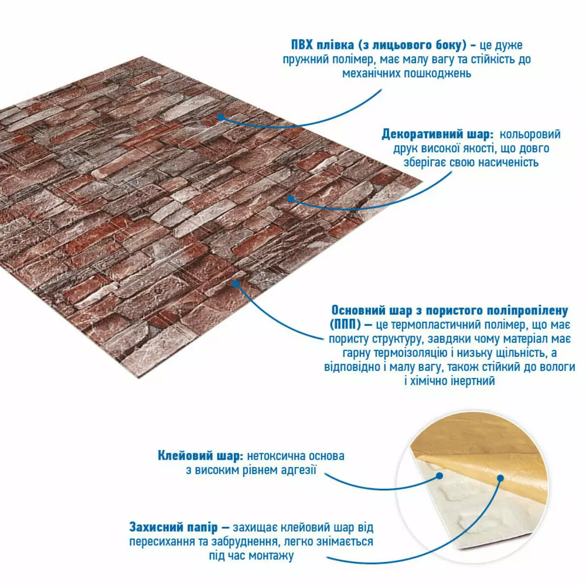 - Захисний папір – оберігає клейовий шар від пересихання та забруднення, легко знімається під час монтажу.