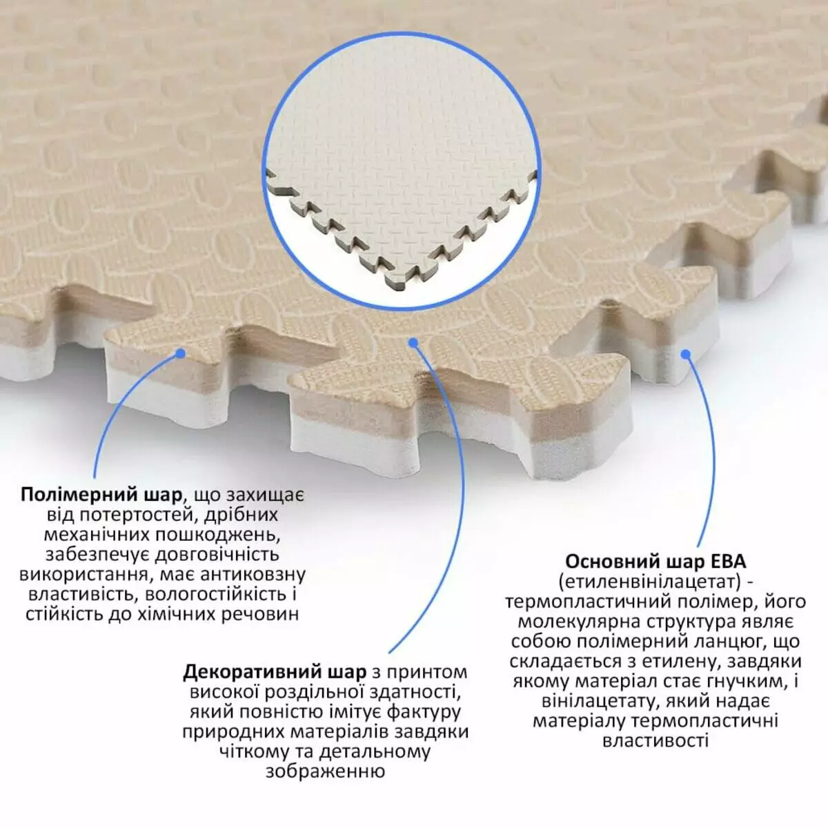 - Основний шар ЕВА (етиленвінілацетат) – термопластичний полімер, його молекулярна структура є полімерним ланцюгом, що складається з етилену, завдяки якому матеріал стає гнучким, і вінілацетату, що надає матеріалу термопластичні властивості. Також у складі містяться спеціальні антистатичні добавки та добавки для утворення комірчастої структури, за рахунок такої структури матеріал набуває термоізоляційних властивостей.