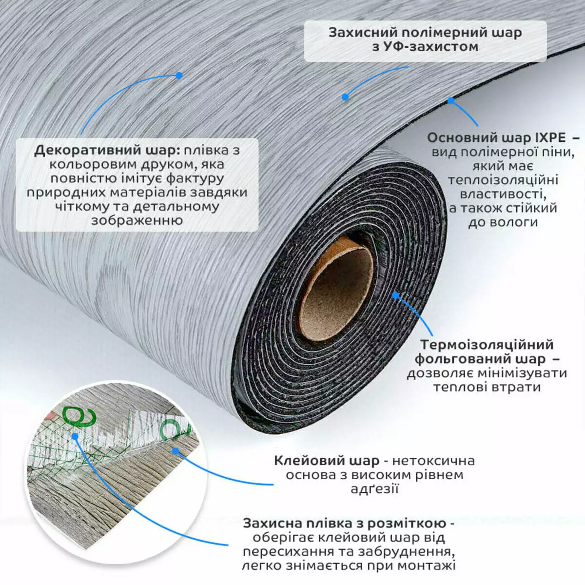 - Термоізоляційний фольгований шар: основна властивість цього шару – відображення теплових хвиль, що дозволяє мінімізувати теплові втрати, тим самим покращити теплоізоляцію приміщення.