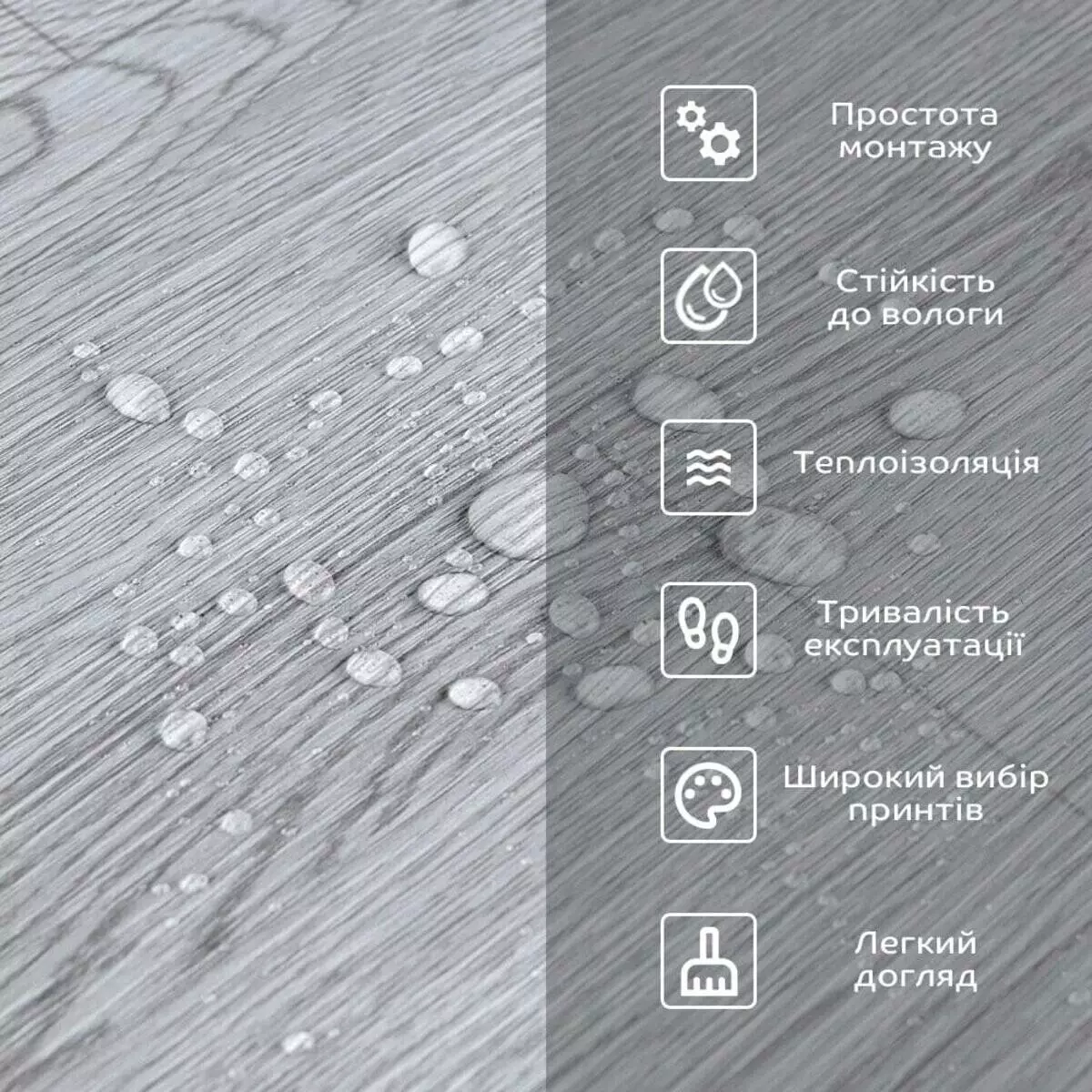 - Естетична складова: широкий вибір принтів, що імітують натуральні матеріали, дозволяє підібрати покриття, яке відповідає вашому стилю та інтер'єру, дуже добре комбінується за гамою кольорів, дозволяючи створити власний дизайн приміщення;