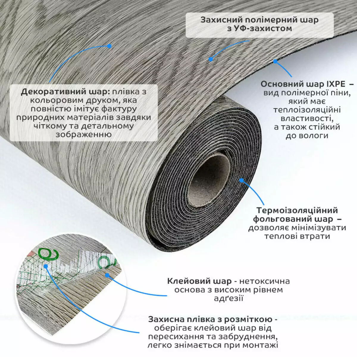 - Термоізоляційний фольгований шар: основна властивість цього шару – відображення теплових хвиль, що дозволяє мінімізувати теплові втрати, тим самим покращити теплоізоляцію приміщення.