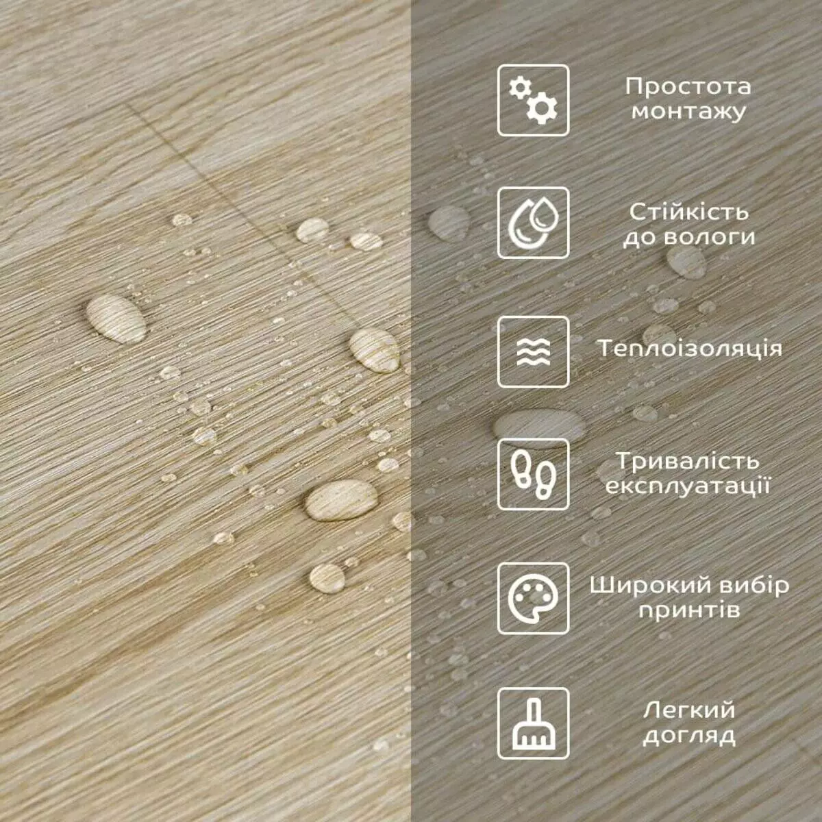 - Естетична складова: широкий вибір принтів, що імітують натуральні матеріали, дозволяє підібрати покриття, яке відповідає вашому стилю та інтер'єру, дуже добре комбінується за гамою кольорів, дозволяючи створити власний дизайн приміщення;