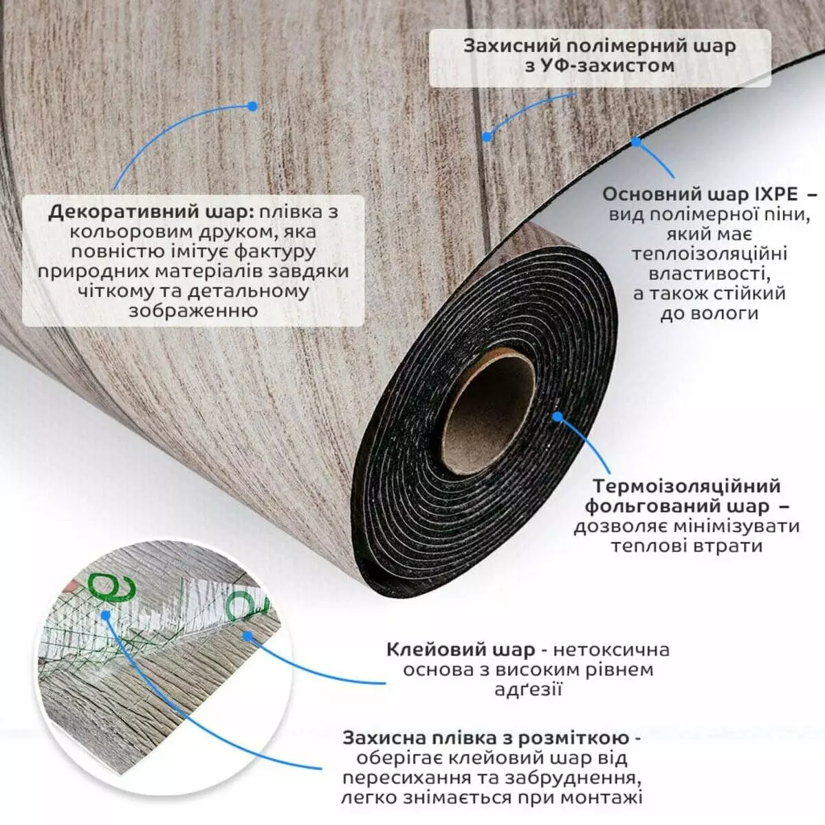- Декоративний шар: плівка з кольоровим друком високої роздільної здатності, яка повністю імітує фактуру природних матеріалів завдяки чіткому та детальному зображенню.