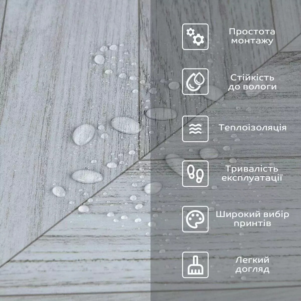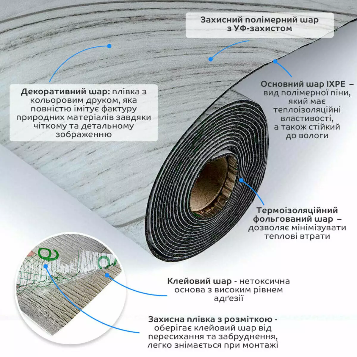 - Декоративний шар: плівка з кольоровим друком високої роздільної здатності, яка повністю імітує фактуру природних матеріалів завдяки чіткому та детальному зображенню.