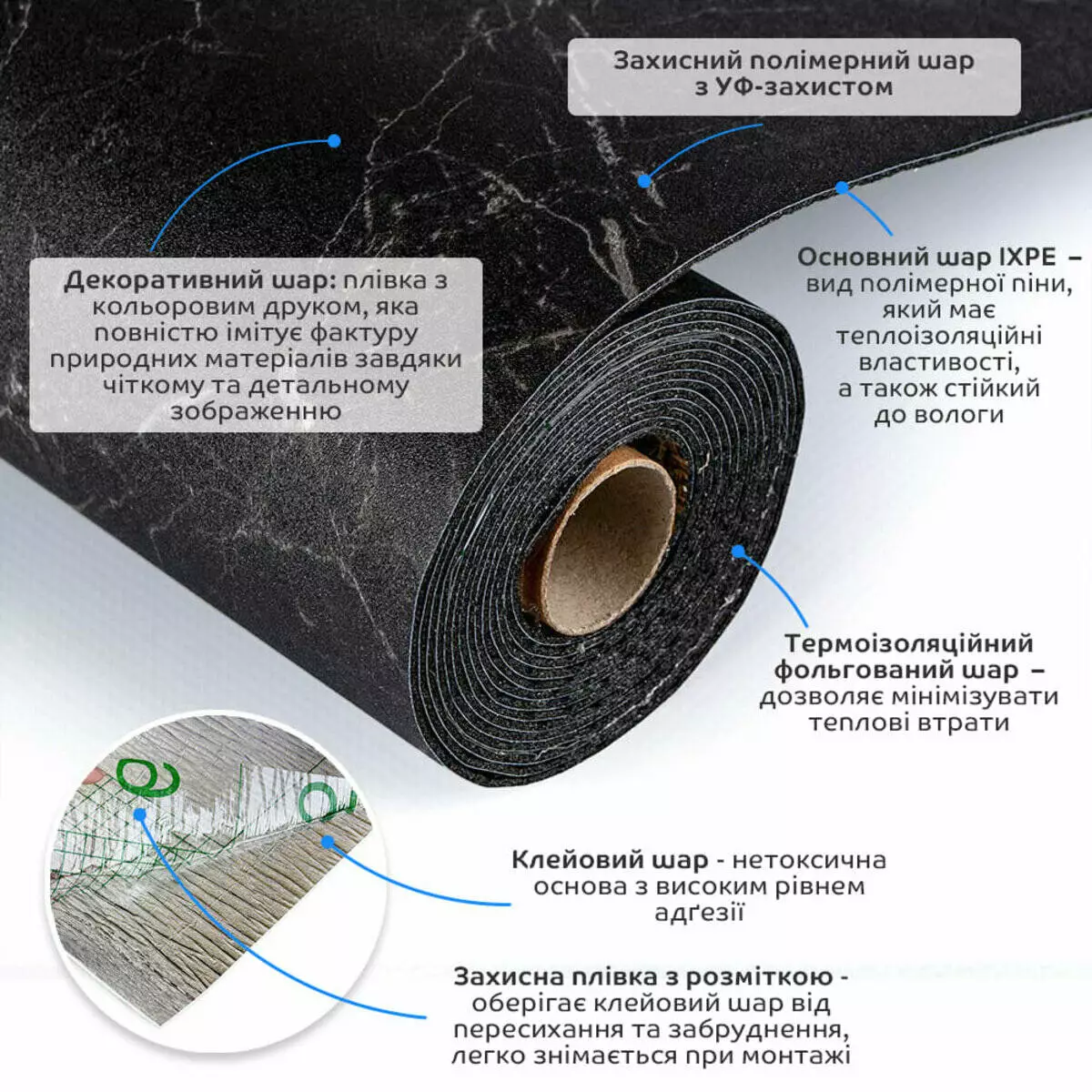 - Термоізоляційний фольгований шар: основна властивість цього шару – відображення теплових хвиль, що дозволяє мінімізувати теплові втрати, тим самим покращити теплоізоляцію приміщення.