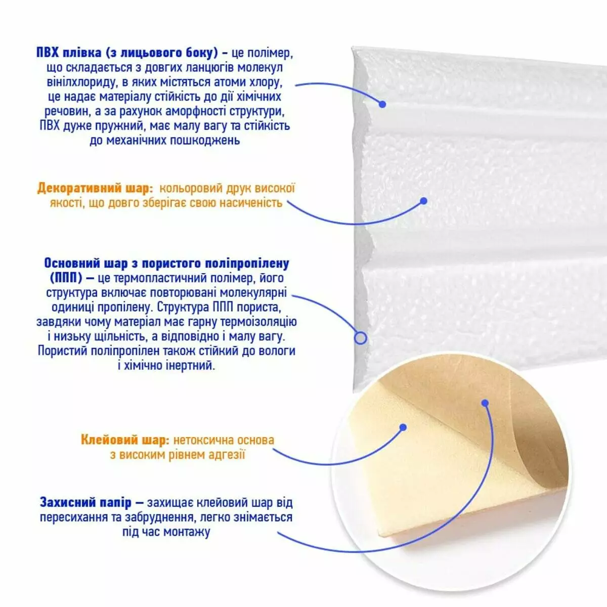 - Декоративний шар: кольоровий друк високої якості, що довго зберігає свою насиченість.