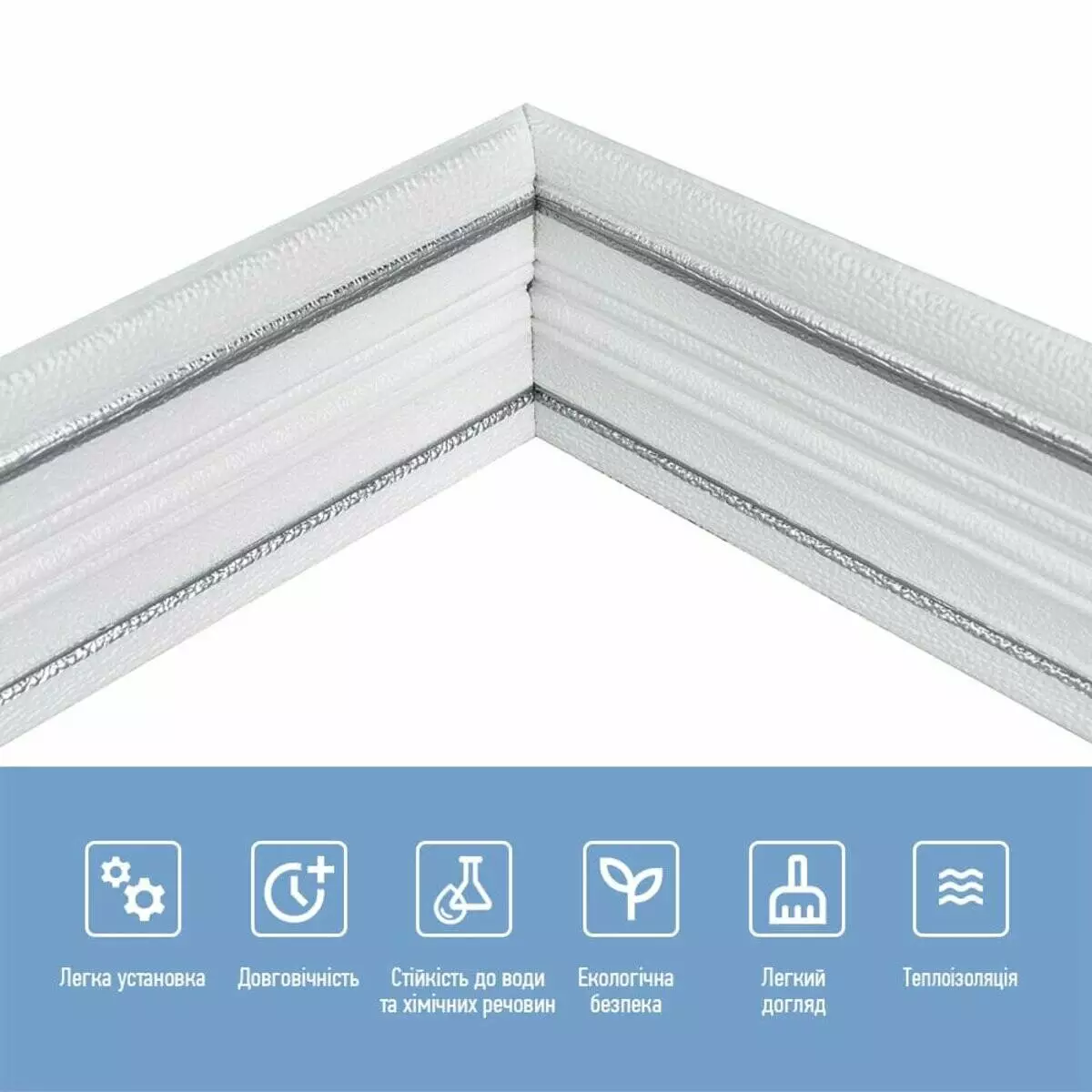 - Захисна плівка – захищає клейовий шар від пересихання та забруднення, легко знімається під час монтажу.