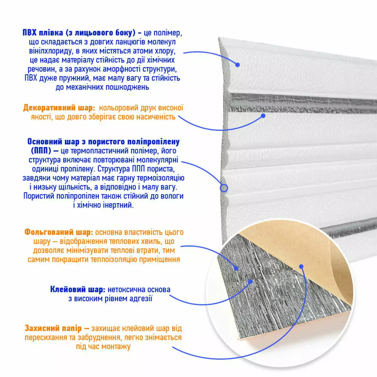 - Декоративний шар: кольоровий друк високої якості, що довго зберігає свою насиченість.