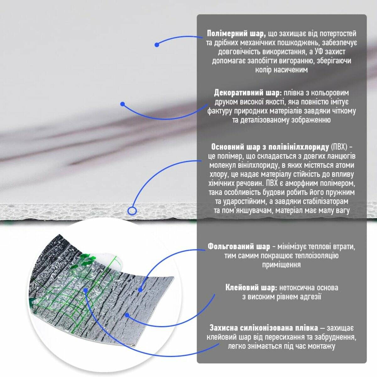 - Декоративний шар: плівка з кольоровим друком високої якості, яка повністю імітує фактуру природних матеріалів завдяки чіткому та деталізованому зображенню.