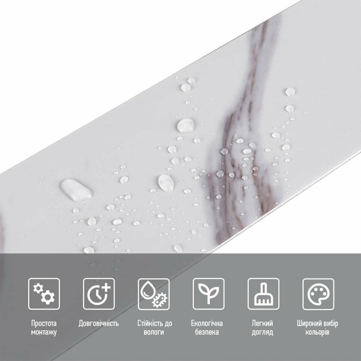 - Стійкість до вологи: вінілові плінтуси стійкі до вологи, що робить їх відмінним вибором для ванних кімнат, кухонь та інших приміщень з підвищеною вологістю, матеріал стійкий також до впливу пари, а також до появи плісняви. Плінтус підходить для створення фартуха кухні, можна клеїти біля плити на відстані не менше ніж 30-50 см;