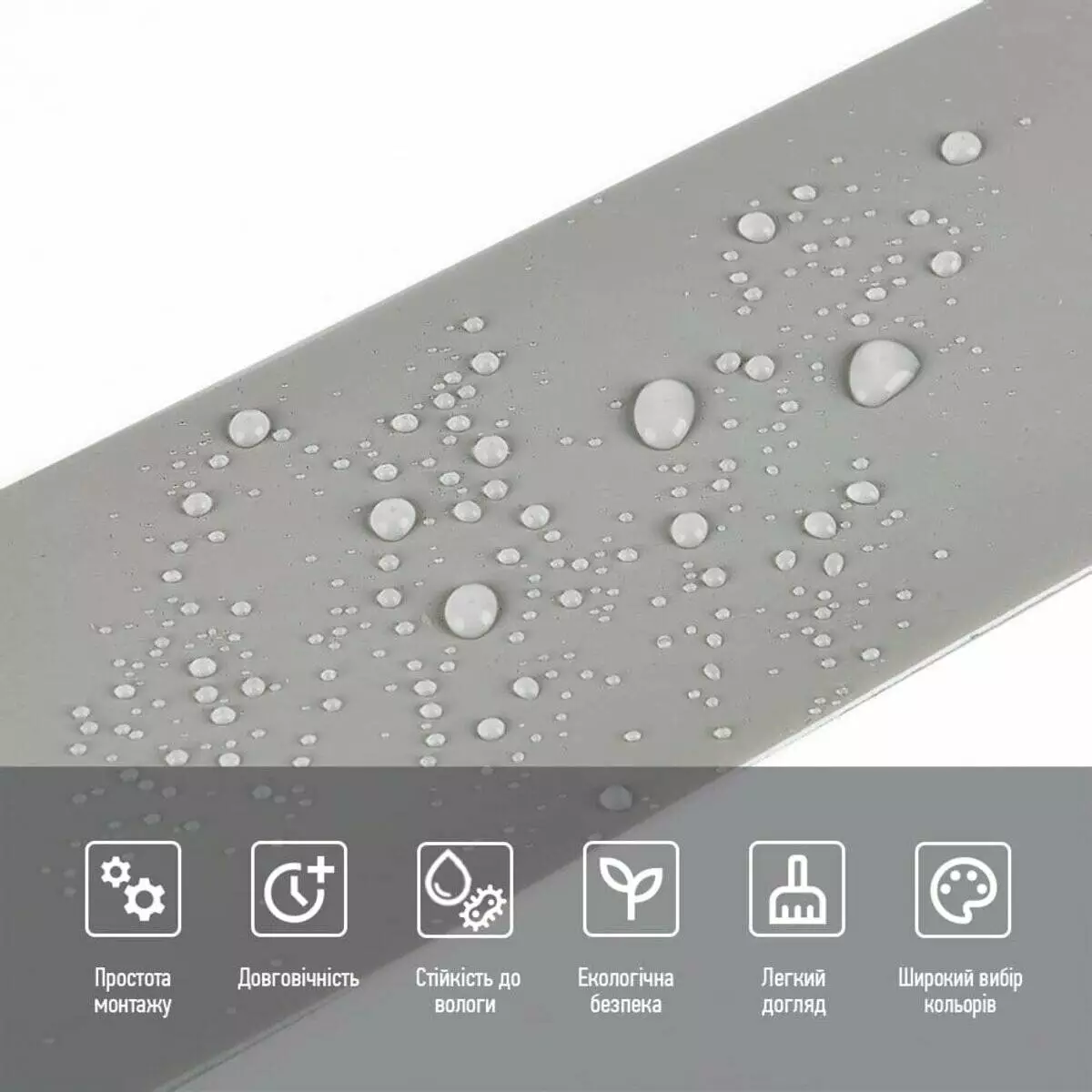 - Стійкість до вологи: вінілові плінтуси стійкі до вологи, що робить їх відмінним вибором для ванних кімнат, кухонь та інших приміщень з підвищеною вологістю, матеріал стійкий також до впливу пари, а також до появи плісняви. Плінтус підходить для створення фартуха кухні, можна клеїти біля плити на відстані не менше ніж 30-50 см;