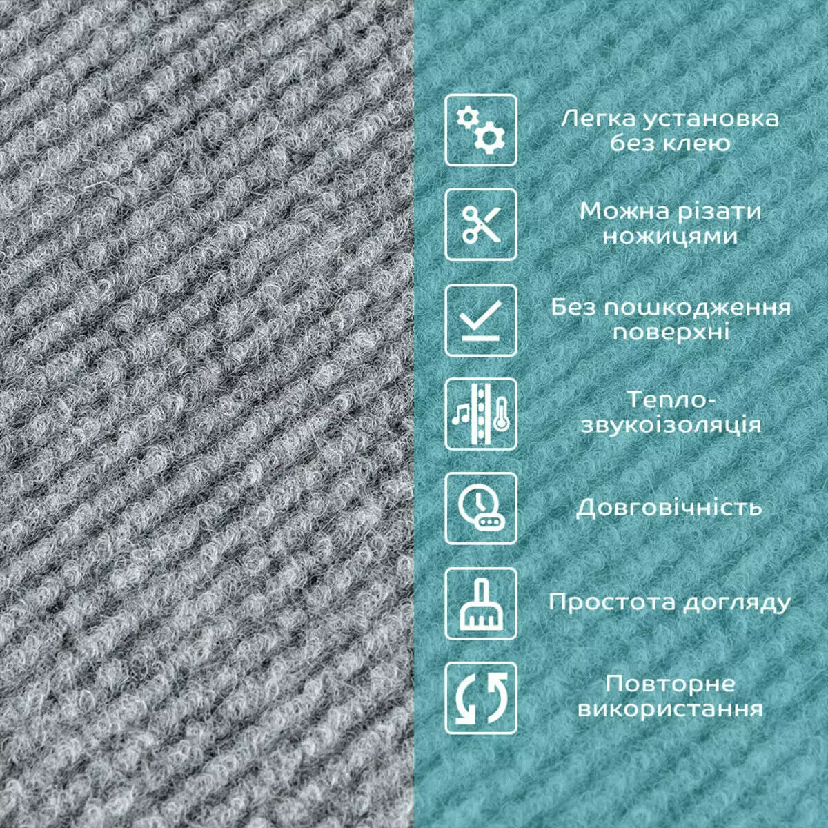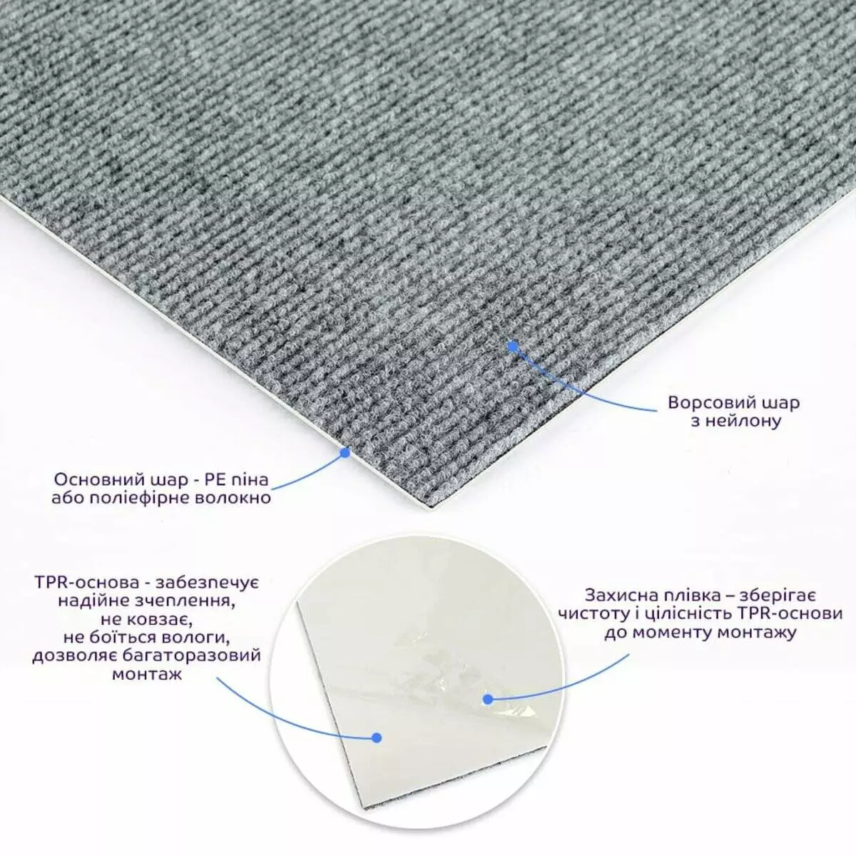 Ковролінова плитка з ТПР-основою — це модульне покриття у вигляді квадратів з м’яким ворсовим шаром та гнучкою основою, яка надійно прилипає до поверхні без використання клею. Завдяки фізичній адгезії плитка тримається на ламінаті, плитці, лінолеумі чи паркеті — не ковзає, не зсувається та не потребує фіксаторів. Також, плитку можна легко демонтувати і використати повторно, не пошкоджуючи покриття та не залишаючи слідів.