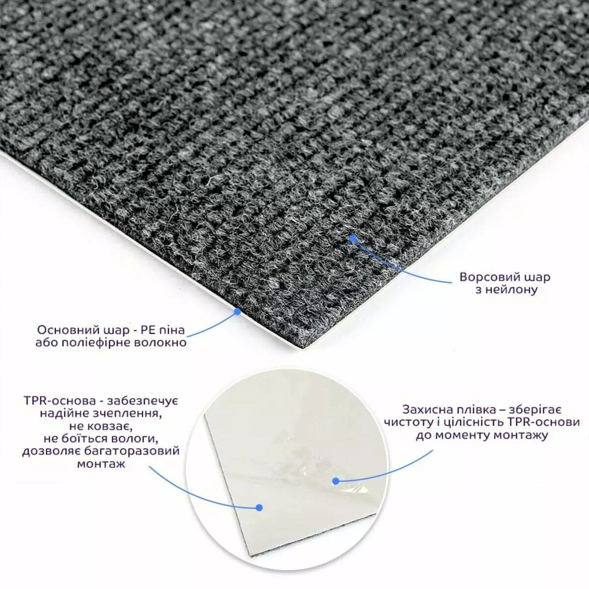 - Зніміть захисну плівку та щільно притисніть ковролінову плитку до поверхні, не використовуючи клей чи інші фіксуючі засоби. ТПР-основа забезпечує надійну фіксацію за рахунок фізичної адгезії.