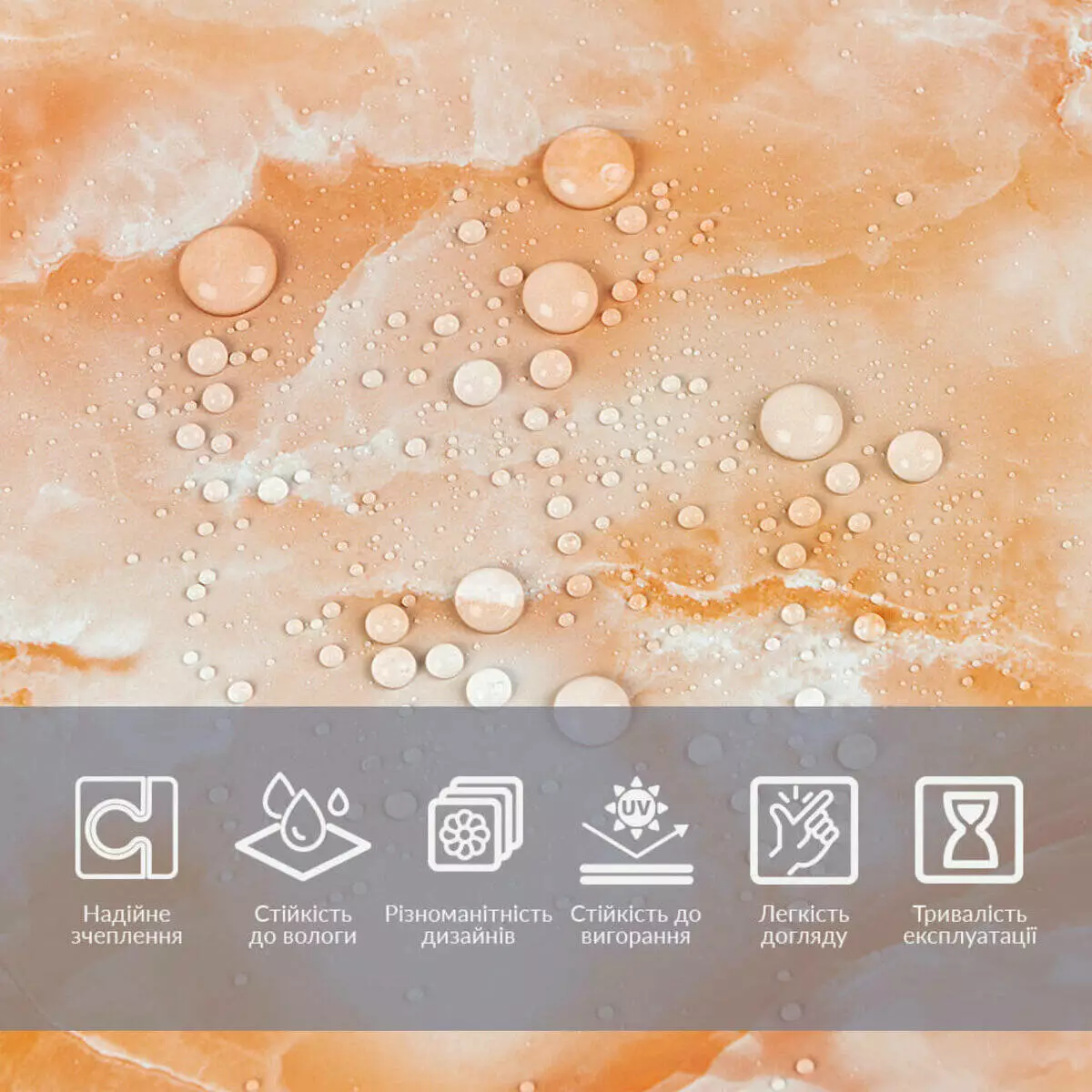 • Вологостійкість: завдяки ламінації, плівка має підвищену стійкість до вологи, що робить її ідеальною для використання у приміщеннях з підвищеною вологістю, таких як кухня чи ванна кімната.