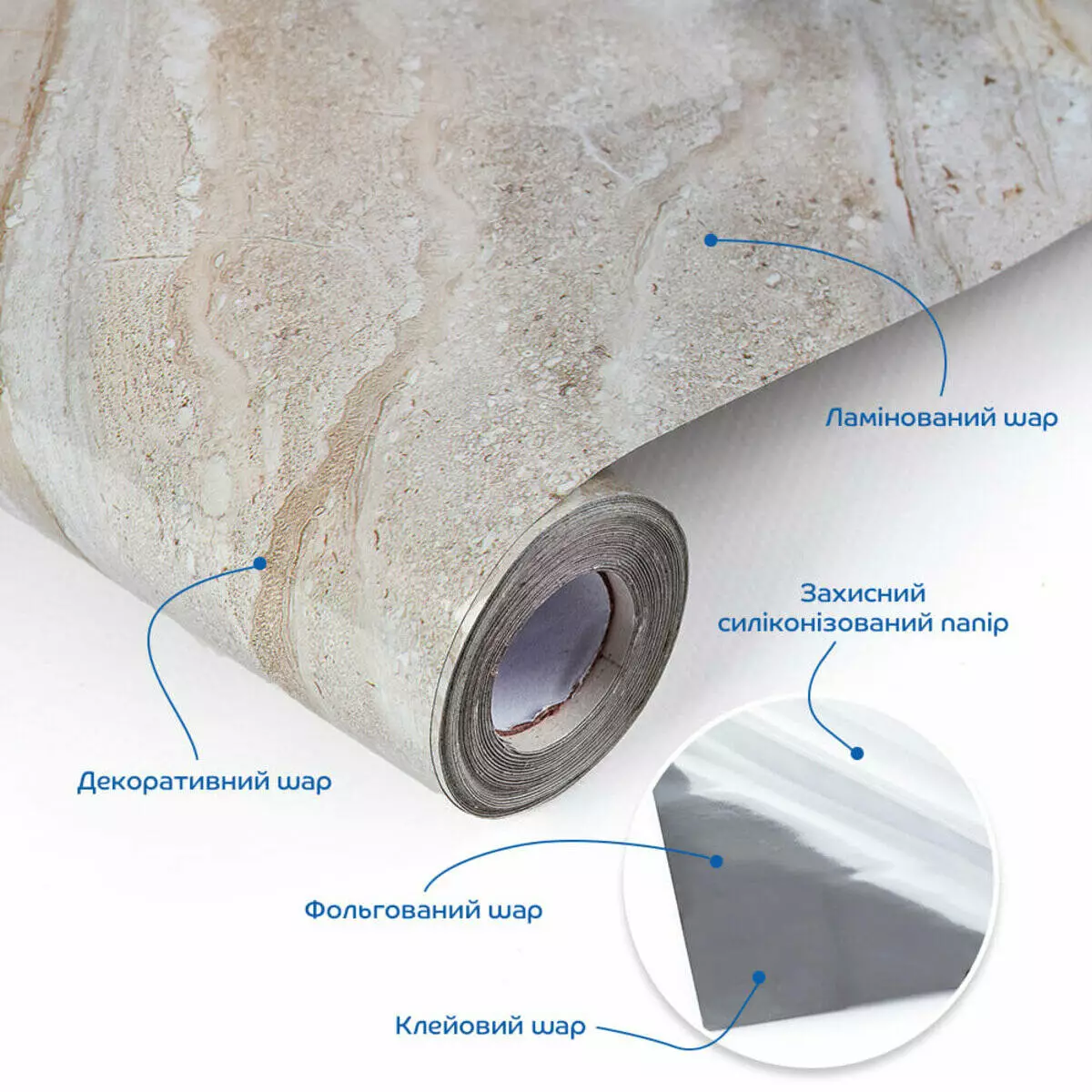 • Декоративний шар. Під ламінацією знаходиться шар з декоративним друком, на якому зображено малюнок або текстура, що імітують дерево, мармур, плитку чи інші матеріали. Цей шар надає плівці візуальну привабливість, що підходить для різноманітних інтер’єрних рішень.