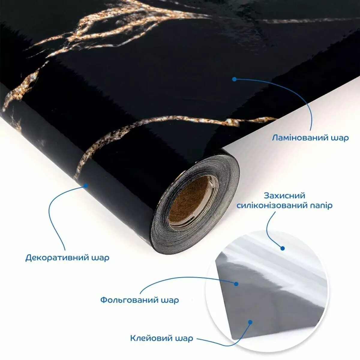 • Декоративний шар. Під ламінацією знаходиться шар з декоративним друком, на якому зображено малюнок або текстура, що імітують дерево, мармур, плитку чи інші матеріали. Цей шар надає плівці візуальну привабливість, що підходить для різноманітних інтер’єрних рішень.