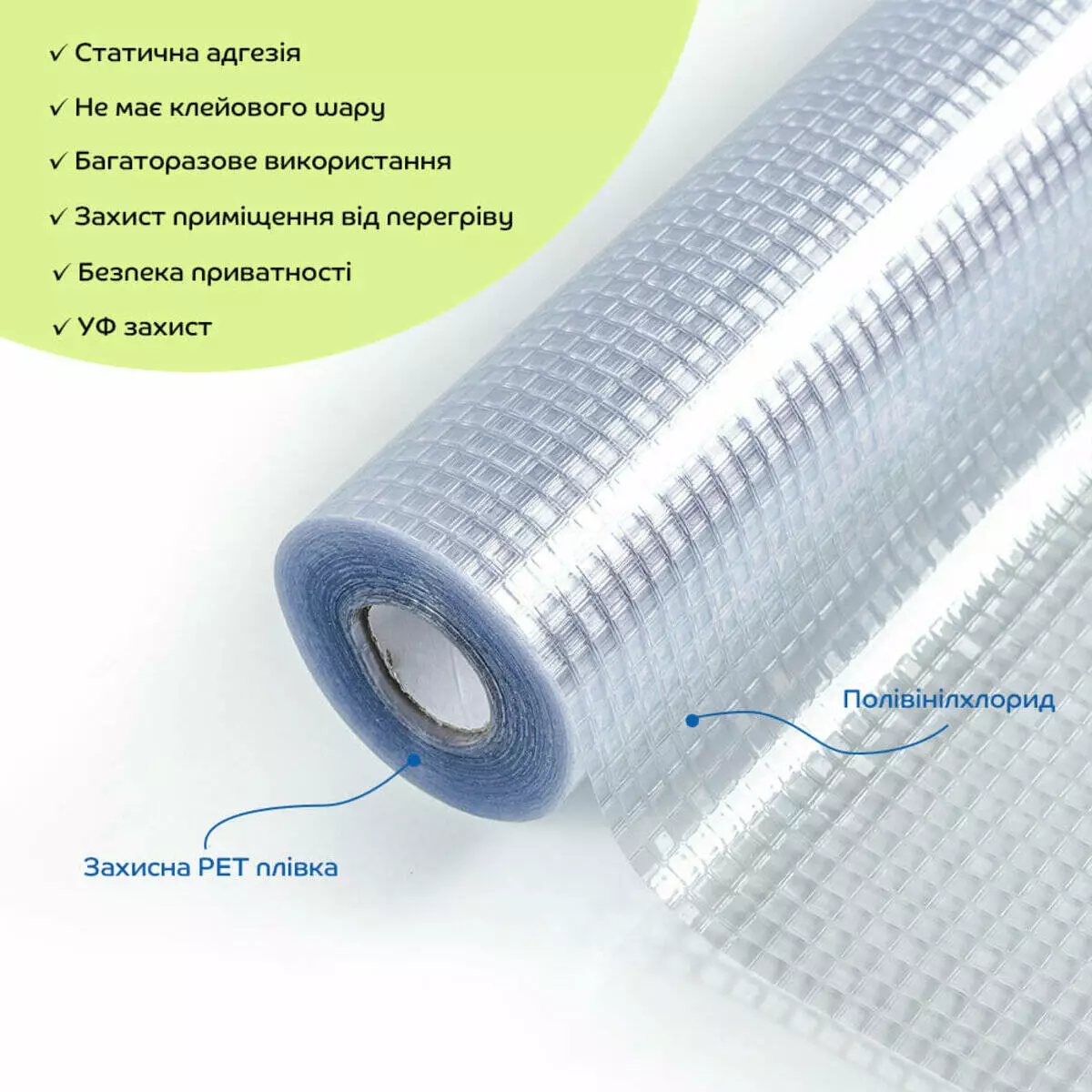 Віконна ПВХ плівка не має клейового шару та кріпиться за допомогою води, працює за принципом статичної адгезії. Це означає, що плівка тримається на поверхні вікна завдяки статичній електриці і щільному приляганню до скла. Вода допомагає забезпечити краще зчеплення між плівкою і склом, зменшуючи кількість бульбашок повітря під плівкою.