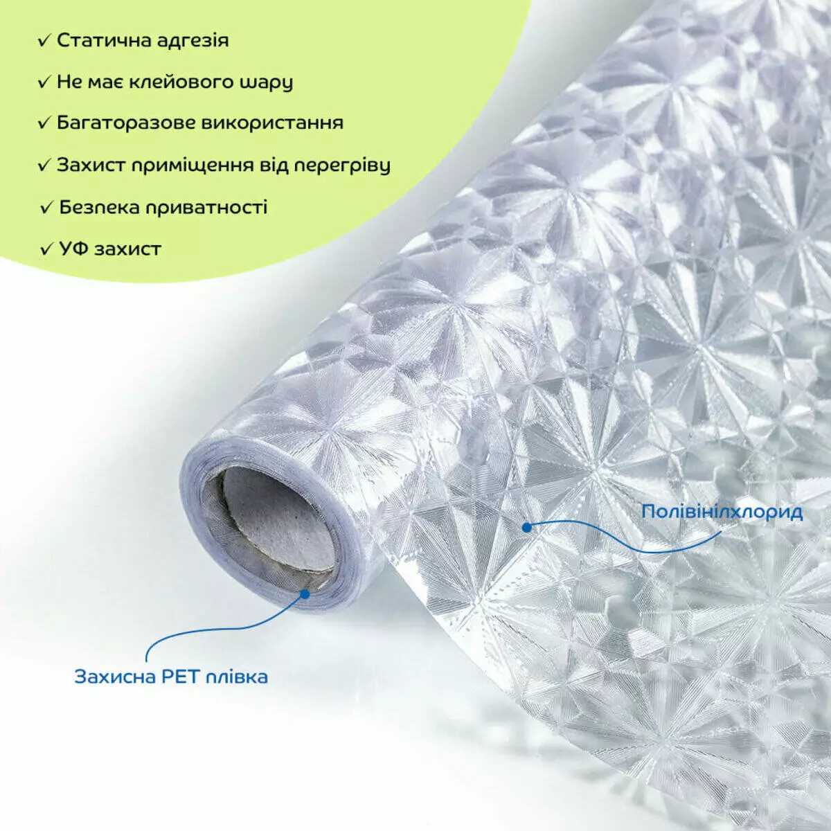 Віконна ПВХ плівка не має клейового шару та кріпиться за допомогою води, працює за принципом статичної адгезії. Це означає, що плівка тримається на поверхні вікна завдяки статичній електриці і щільному приляганню до скла. Вода допомагає забезпечити краще зчеплення між плівкою і склом, зменшуючи кількість бульбашок повітря під плівкою.