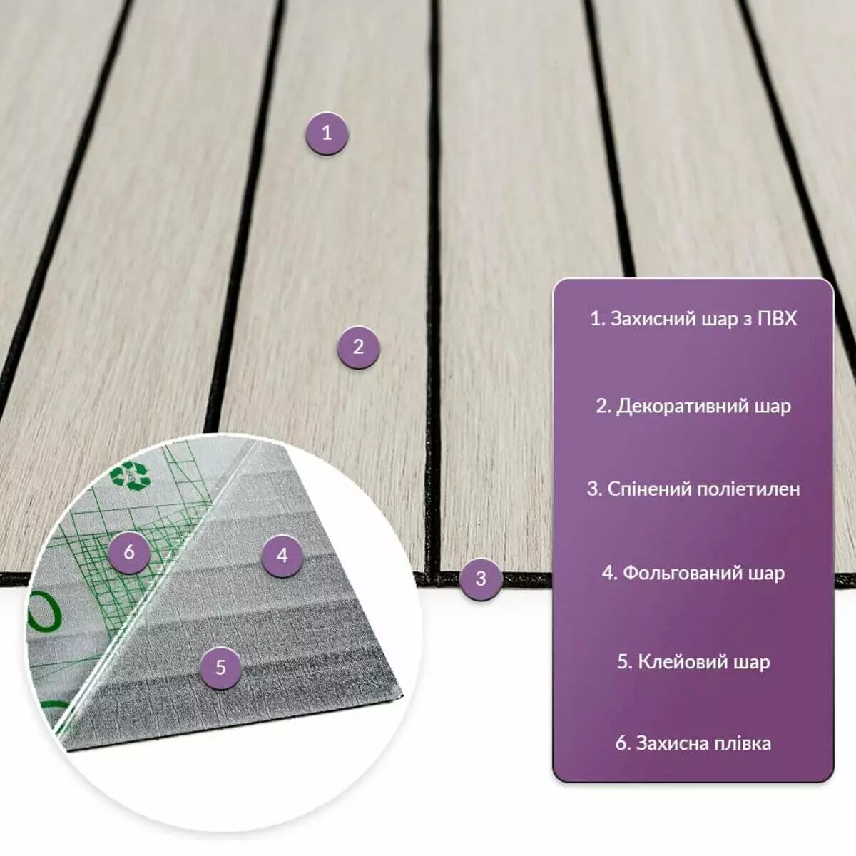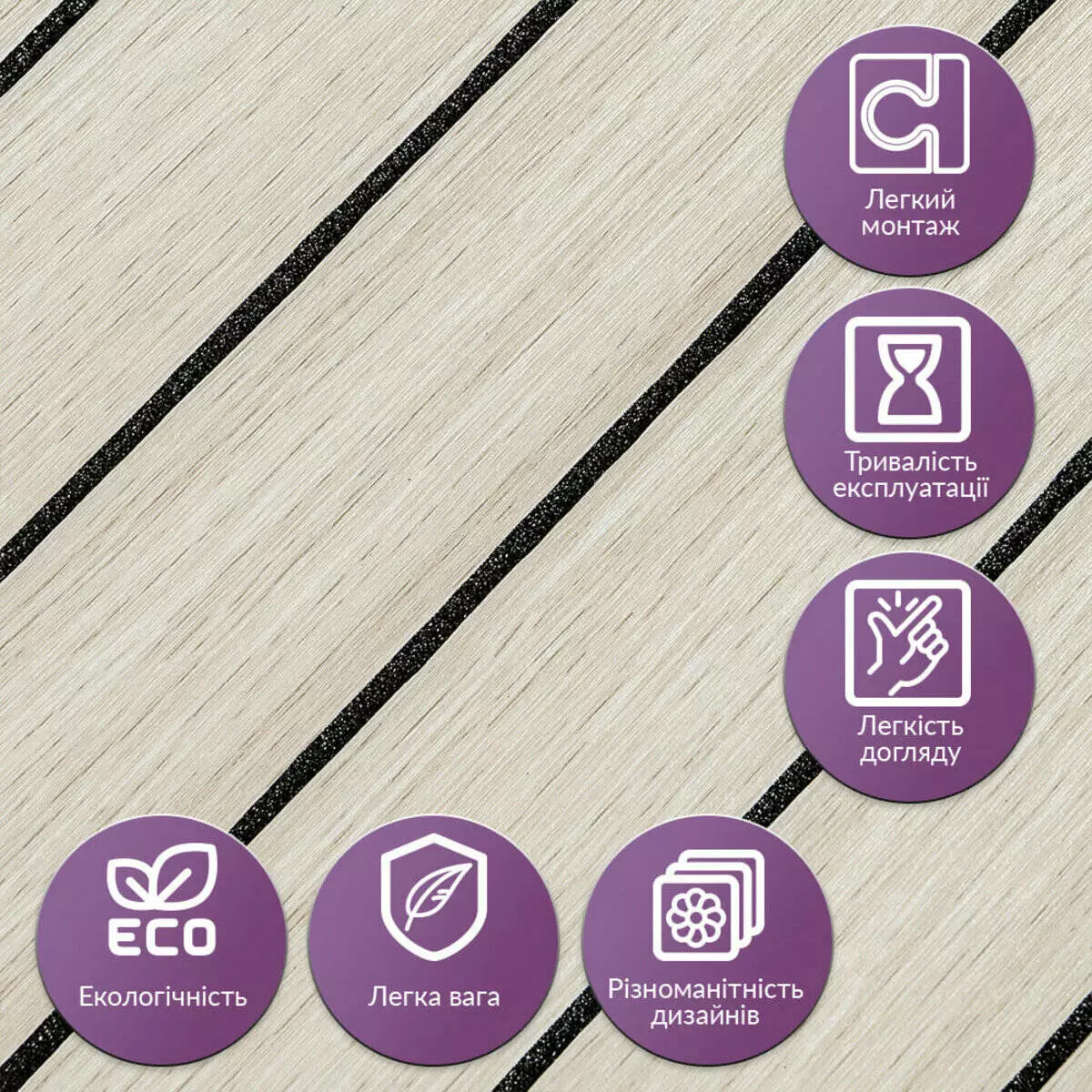 - Легкий догляд: Вінілові рейки легко миються, не вимагають спеціальних засобів для очищення і не вбирають бруд.