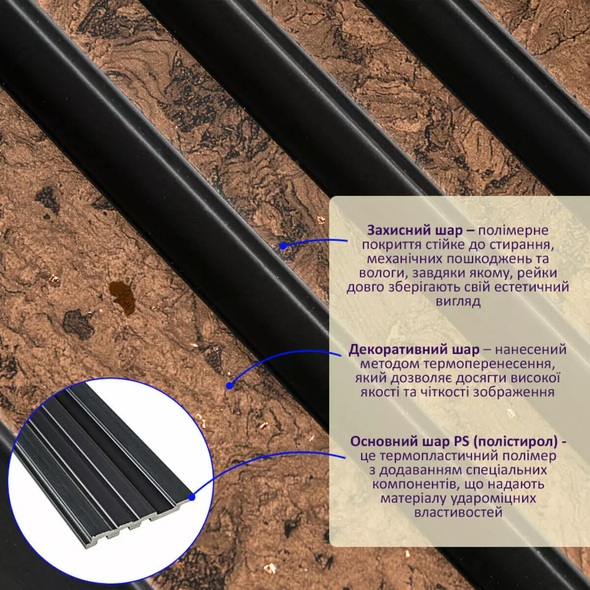 - Захисний шар – полімерне покриття стійке до стирання, механічних пошкоджень та вологи, завдяки якому, рейки довго зберігають свій естетичний вигляд.
