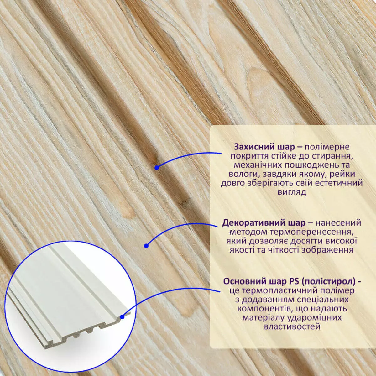 - Захисний шар – полімерне покриття стійке до стирання, механічних пошкоджень та вологи, завдяки якому, рейки довго зберігають свій естетичний вигляд.