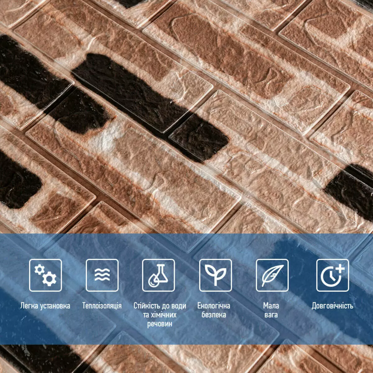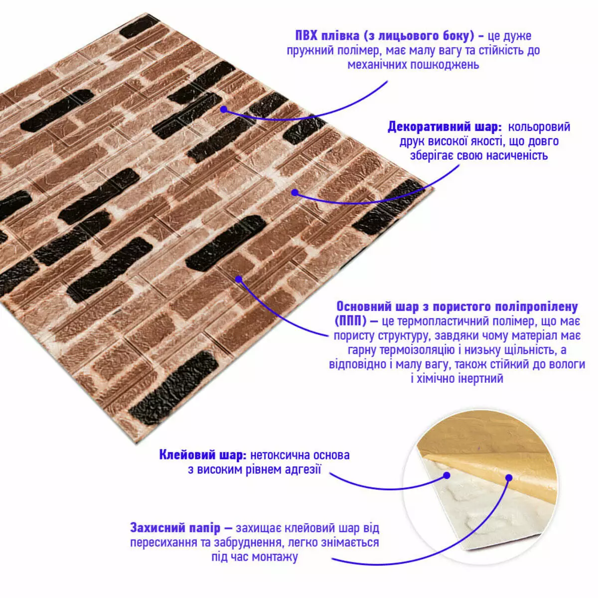 3D панелі самоклеючі – декоративне покриття для стін, виконане з легкого та міцного матеріалу – пористого поліпропілену (ППП). Основна особливість – рельєфний малюнок у вигляді цегли у широкому різноманітті кольорів та наявність клейового шару, що дозволяє встановити панелі без необхідності застосування додаткових матеріалів.