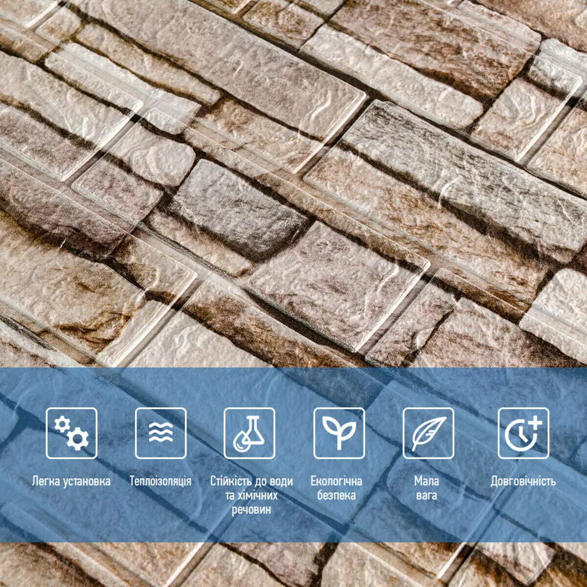 3D панелі самоклеючі – декоративне покриття для стін, виконане з легкого та міцного матеріалу – пористого поліпропілену (ППП). Основна особливість – рельєфний малюнок у вигляді цегли у широкому різноманітті кольорів та наявність клейового шару, що дозволяє встановити панелі без необхідності застосування додаткових матеріалів.