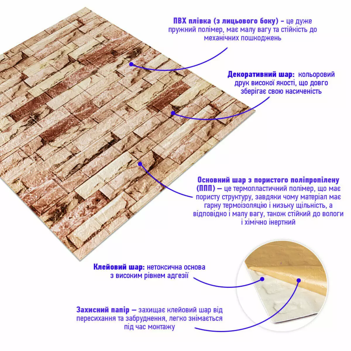 - Захисний папір – оберігає клейовий шар від пересихання та забруднення, легко знімається під час монтажу.