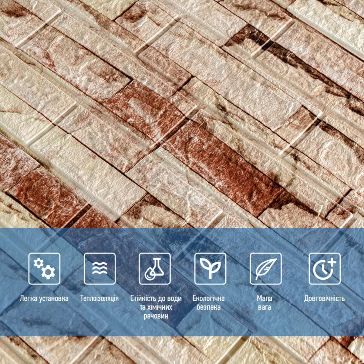 3D панелі самоклеючі – декоративне покриття для стін, виконане з легкого та міцного матеріалу – пористого поліпропілену (ППП). Основна особливість – рельєфний малюнок у вигляді цегли у широкому різноманітті кольорів та наявність клейового шару, що дозволяє встановити панелі без необхідності застосування додаткових матеріалів.
