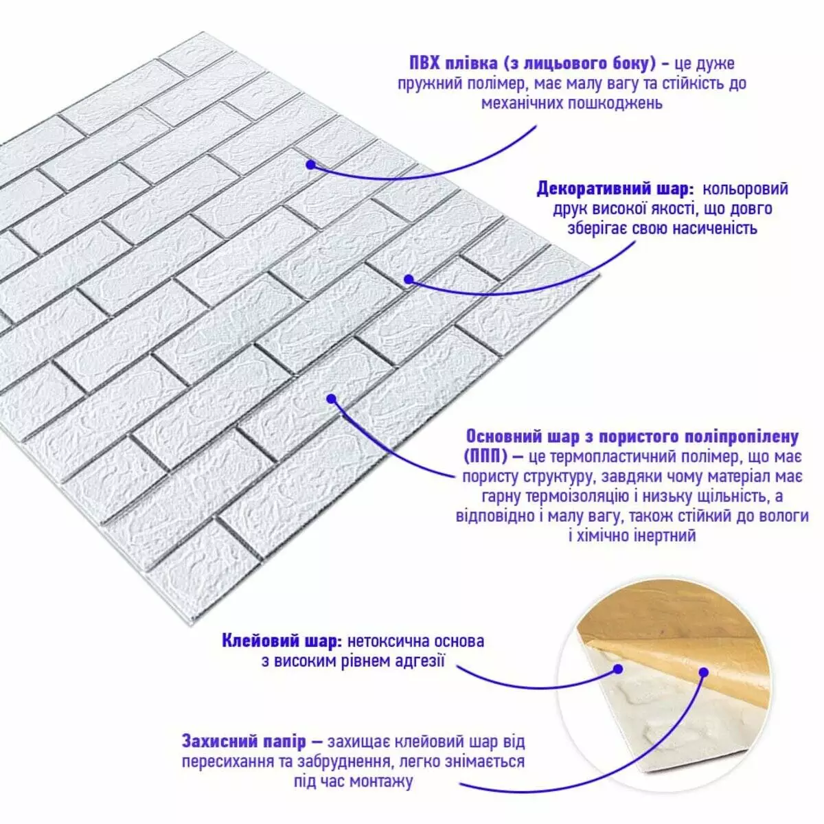 - Захисний папір – оберігає клейовий шар від пересихання та забруднення, легко знімається під час монтажу.