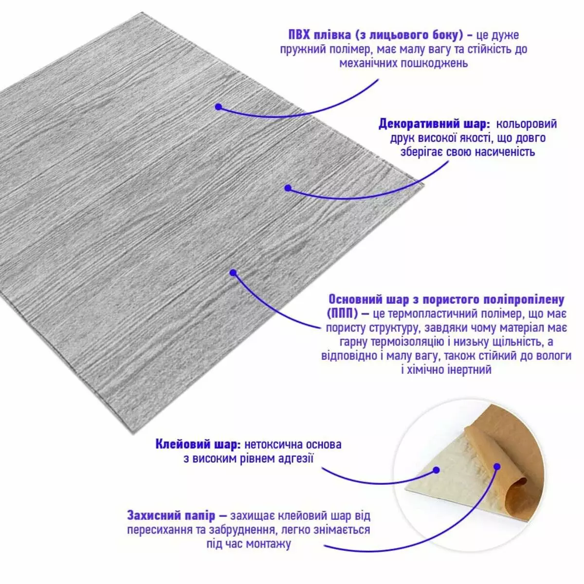 - Легкість монтажу: наявність клейового шару дозволяє встановити панелі без необхідності застосування додаткових матеріалів.