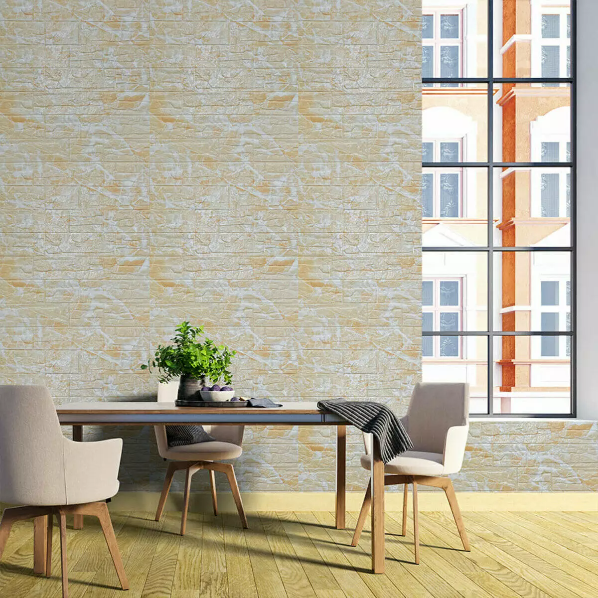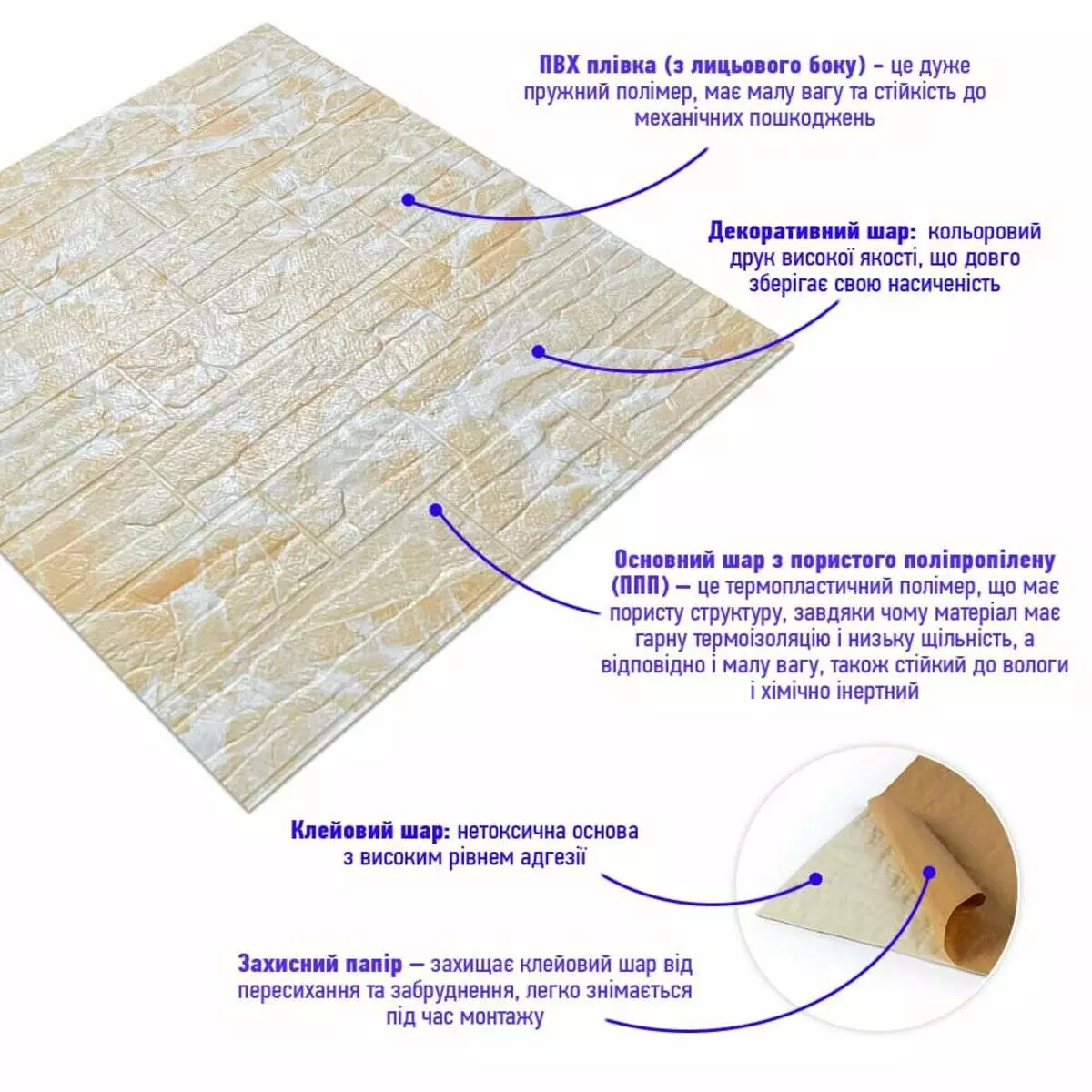 Декоративна панель під камінь виготовлена із спіненого поліпропілену. Це універсальний і щільний матеріал, але водночас легкий. Його термін служби понад 20 років. Самоклеючі 3D панелі з поліпропілену - це швидкий ремонт з мінімумом шуму та будівельного сміття.