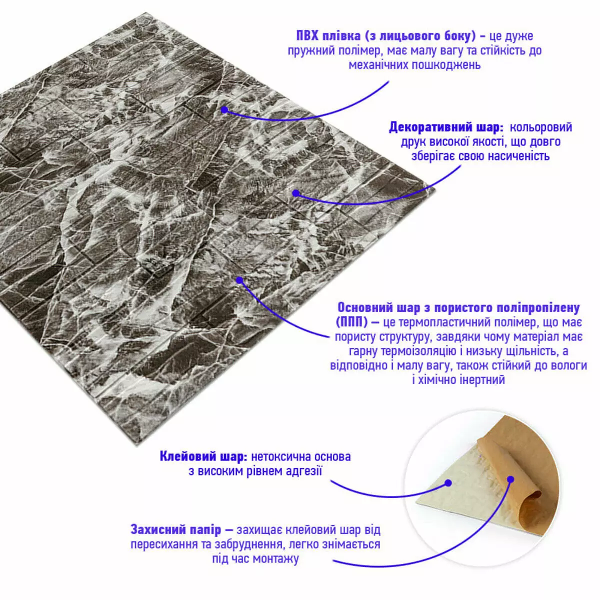 Декоративна панель під камінь виготовлена із спіненого поліпропілену. Це універсальний і щільний матеріал, але водночас легкий. Його термін служби понад 20 років. Самоклеючі 3D панелі з поліпропілену - це швидкий ремонт з мінімумом шуму та будівельного сміття.