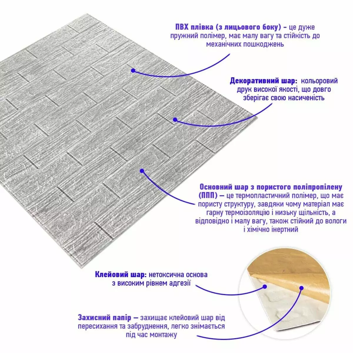 - Захисний папір – оберігає клейовий шар від пересихання та забруднення, легко знімається під час монтажу.