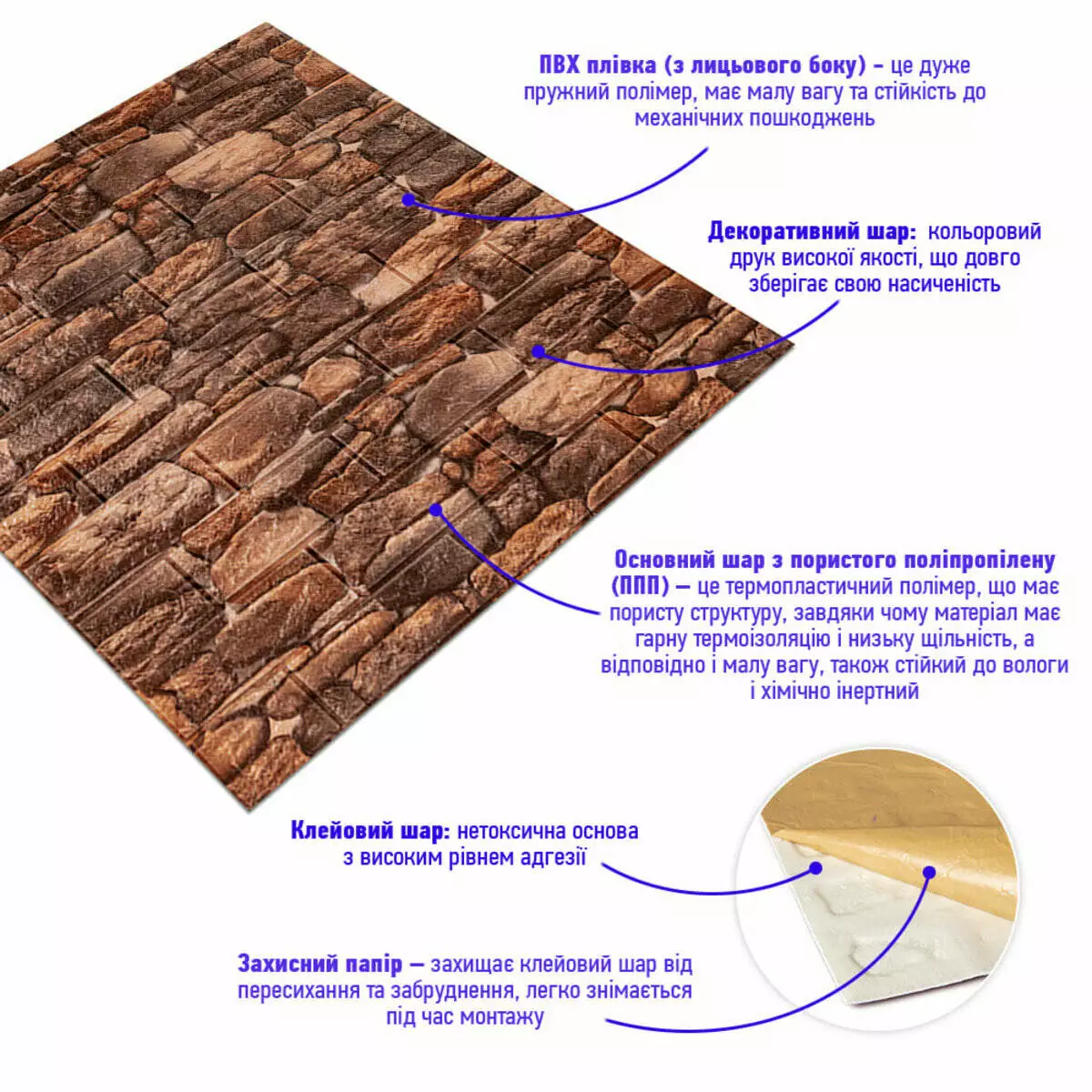 - Захисний папір – оберігає клейовий шар від пересихання та забруднення, легко знімається під час монтажу.